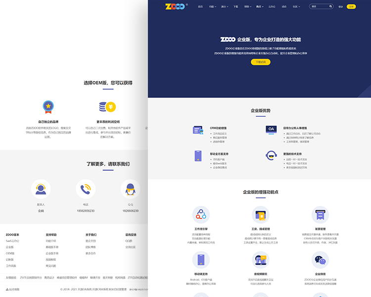 因为是软件系统,所以作为网站的主要功能为展示系统软件的功能和使用说明,内容说明用颜色鲜明的色调介绍功能与架构,便于用户迅速get到ZDOO全协同管理软件的亮点。
