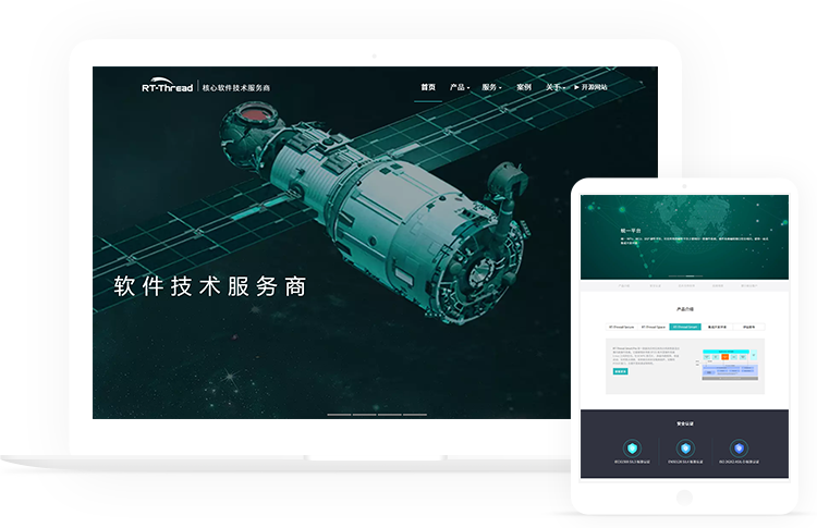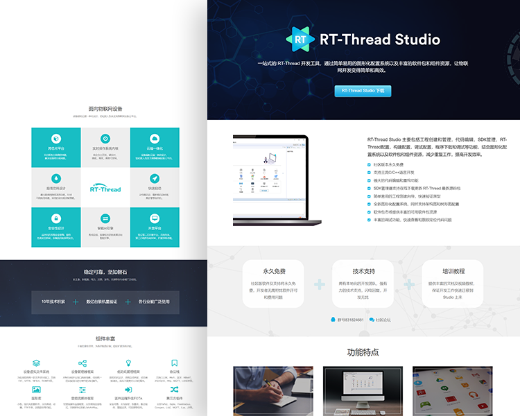 作为当代主流行业平台的研发者,网站整体要求科技感强,为了凸显RT-Thread专业的技术,在网站设计上采用蓝绿色的色调,展现专业性的同时也不显得特别沉重。展示上采用重心型与分割型结合版式的banner,让浏览者产生视觉焦点的同时,将注意力放在产品介绍上。