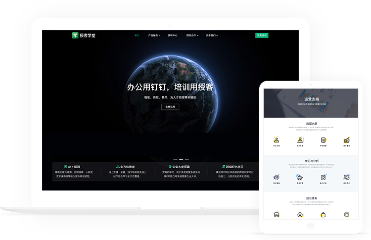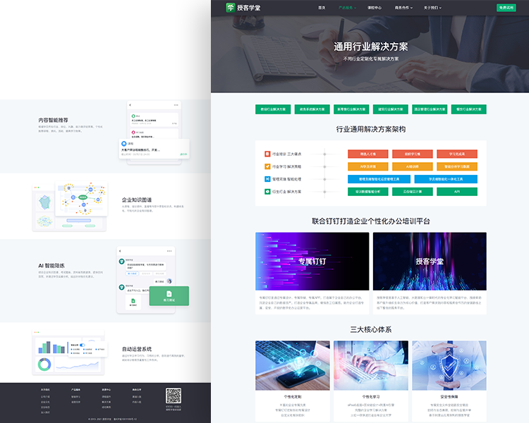 作为国内领先的AI智能化组织学习赋能平台SaaS提供商,为体现平台授课学堂的网站采用科技感较强的滚动式网站的展示方式,用大量图片与文字相结合的特效,展示信息,使得整个网站的可阅读性迅速提升,保证界面优美的情况下还能有效的阅读。
